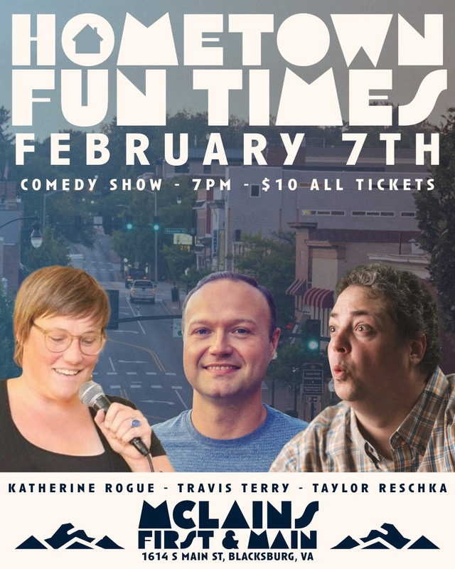 The night will feature Taylor Reschka who brings warm, light-hearted, and highly relatable comedy that consistently connects with any crowd. If you're feeling weird, Travis Terry leans into the absurd with playful, unexpected storytelling and big, silly ideas. Then, Katherine Rogue closes the night with sharp, confident wit and a commanding presence. She’s widely regarded as the Queen of Comedy in the New River Valley for a reason! Three distinct voices. One great room! Come out and catch some of the best comedy the region has to offer!