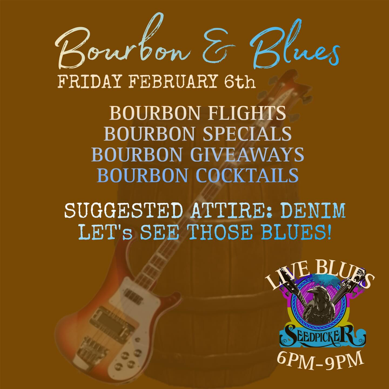 Enjoy bourbon flights, bourbon specials, bourbon giveaways and Bourbon cocktails along with live blues music from Seedpicker from 6:00-9:00 PM.