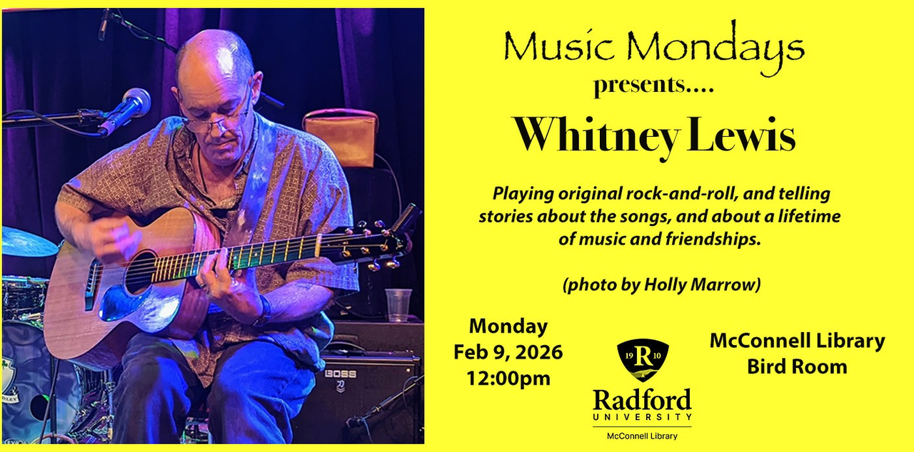 The McConnell Library, on the campus of Radford University, and Radford University Archives and Special Collections continues their Spring Semester Music Mondays series with Whitney Lewis in concert on Monday, February 9, 2026 inside the Bird Room.