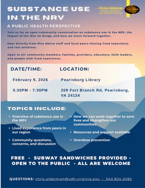 The Pearisburg Library presents the program "Substance Use in the NRV: A Public Health Perspective" on Monday, February 9, 2026.