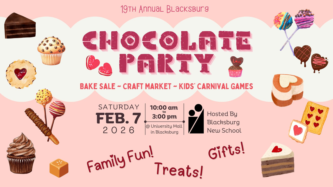 The Blacksburg New School presents their 19th Annual Chocolate Party on Saturday, February 7, 2026 at the University Mall in Blacksburg, VA.