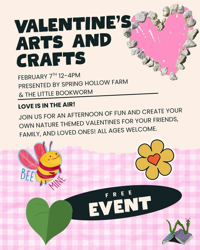 The Little Bookworm and Spring Hollow Farm presents Valentine's Arts and Crafts on Saturday, February 7, 2026.