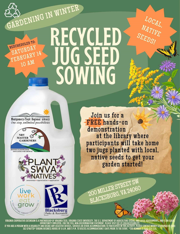 The Blacksburg Library and the New River Valley Master Gardener Association presents the program "Gardening in Winter: Sowing Native, Local Seeds in Recycled Milk Jugs" on Saturday, February 7, 2026 at the Blacksburg Library.
