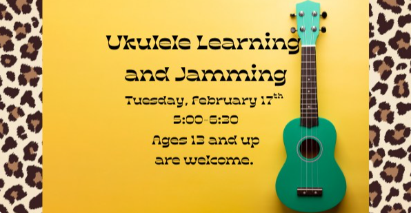 The Jessie Peterman Library presents Ukulele Learning and Jamming for Ages 13 & Up on Tuesday, February 17, 2026.