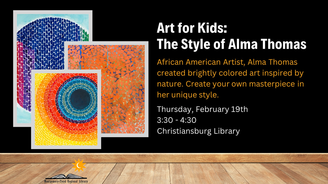 The Christiansburg Library presents the program "Art for Kids: The Style of Alma Thomas" on Thursday, February 19, 2026.