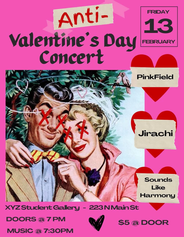 XYZ Art Gallery presents the Anti-Valentine's Day Concert with Pinkfield, Jirachi and Sounds Like Harmony on Friday, February 13, 2026.