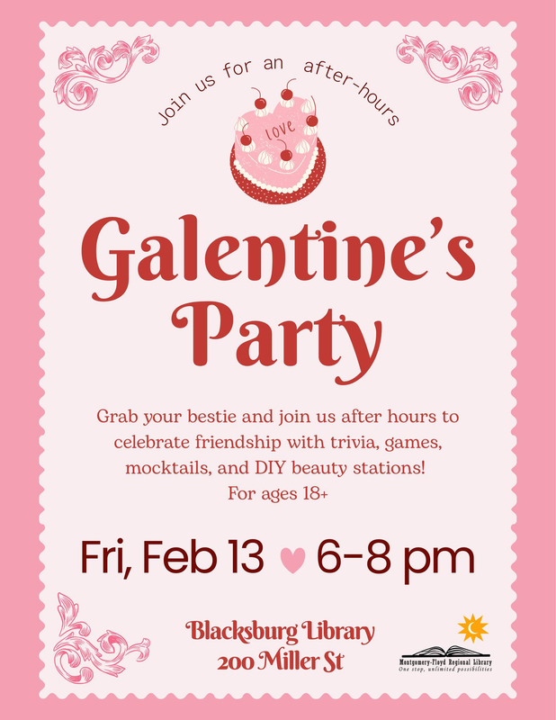 The Blacksburg Library presents Galentine's Party on Friday, February 13, 2026.
