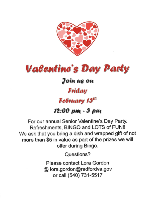 Radford Parks & Rec presents their Senior Valentine's Day Party with Bingo on Friday, February 13, 2026 at Radford Recreation Center.