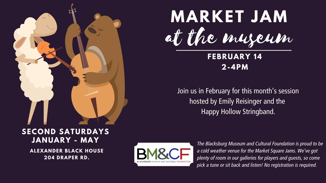 The Blacksburg Museum and Cultural Foundation continues their February Market Jam at the Museum series on Saturday, February 14, 2026 at the Alexander Black House.