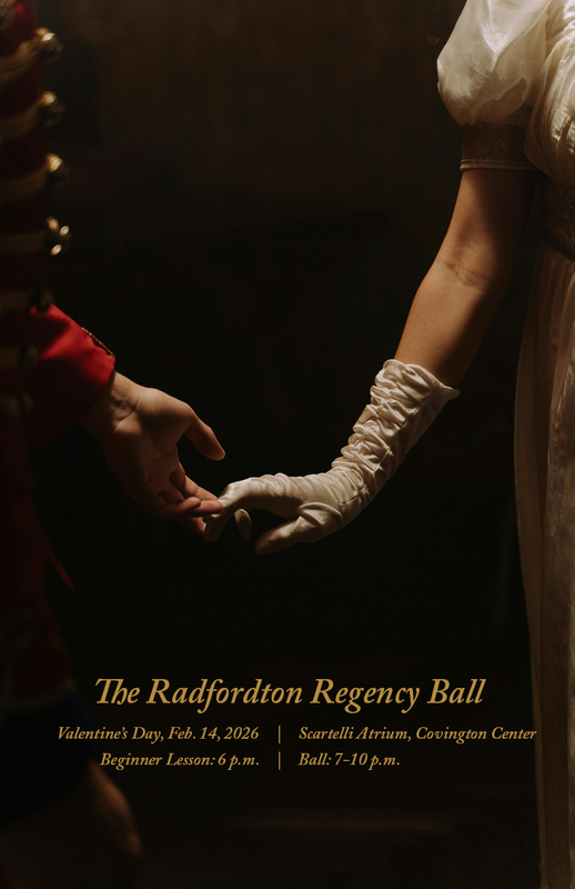 The Radford University College of Visual & Performing Arts presents The Radfordton Regency Ball on Saturday, February 14, 2026 within Scartelli Atrium located in the Covington Center on the campus of Radford University.