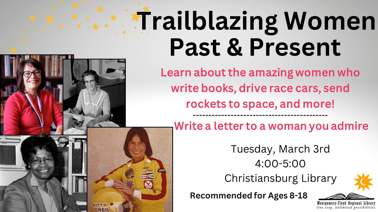 The Christiansburg Library presents the program "Trailblazing Women Past & Present" on Tuesday, March 3, 2026.