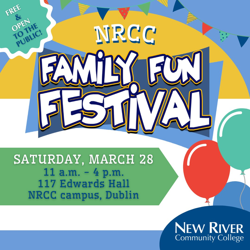 New River Community College presents their Annual Family Fun Festival their Dublin, VA campus on Saturday, March 28, 2026 headquartered in Edwards Hall, Room 117.