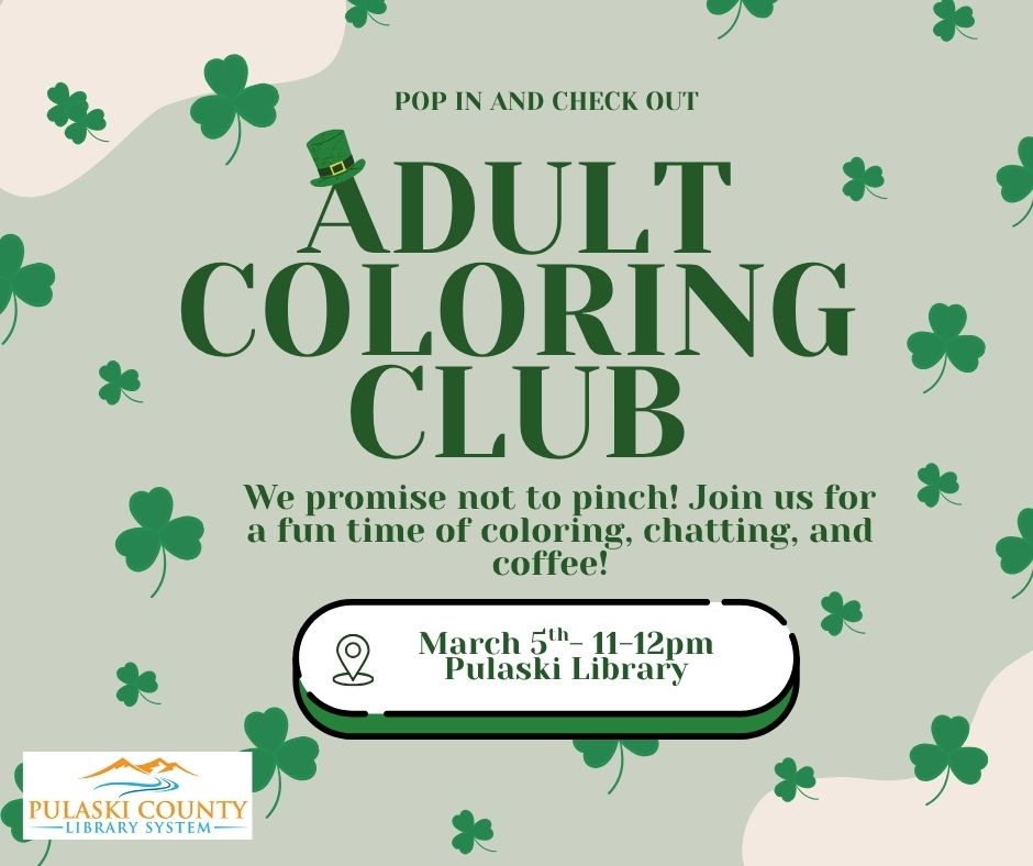Pulaski County Library presents their March Adult Coloring Club on Thursday, March 5, 2026.