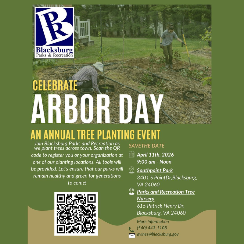 Blacksburg Parks & Recreation presents the Annual Arbor Day Celebration on Saturday, April 11, 2026 at two locations including the Blacksburg Parks & Recreation Administrative Offices and Southpoint Park.