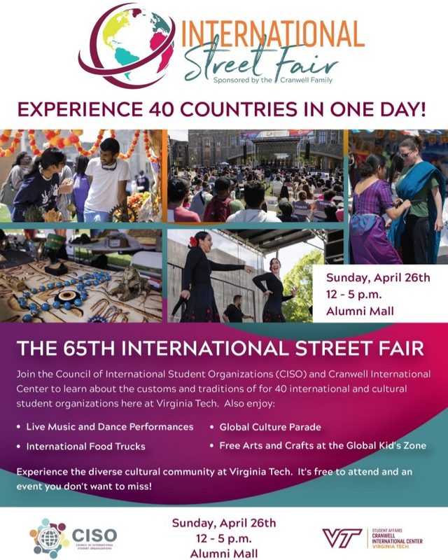 The Council of International Student Organizations (CISO) and Cranwell International Center presents the 65th International Street Fair on Sunday, April 26, 2026 at Alumni Mall on the Virginia Tech campus.