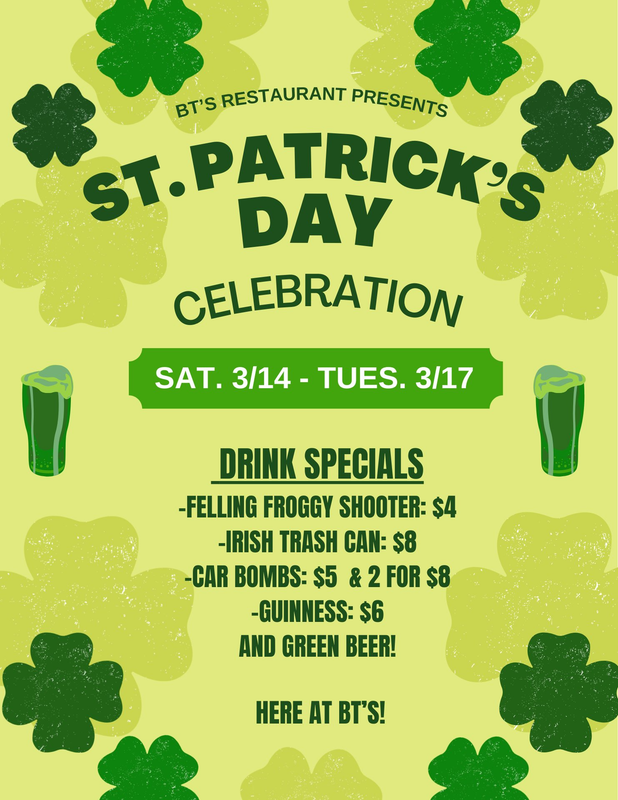 BT's Restaurant presents their 2026 St. Patrick's Day Celebration on Tuesday, March 17, 2026.