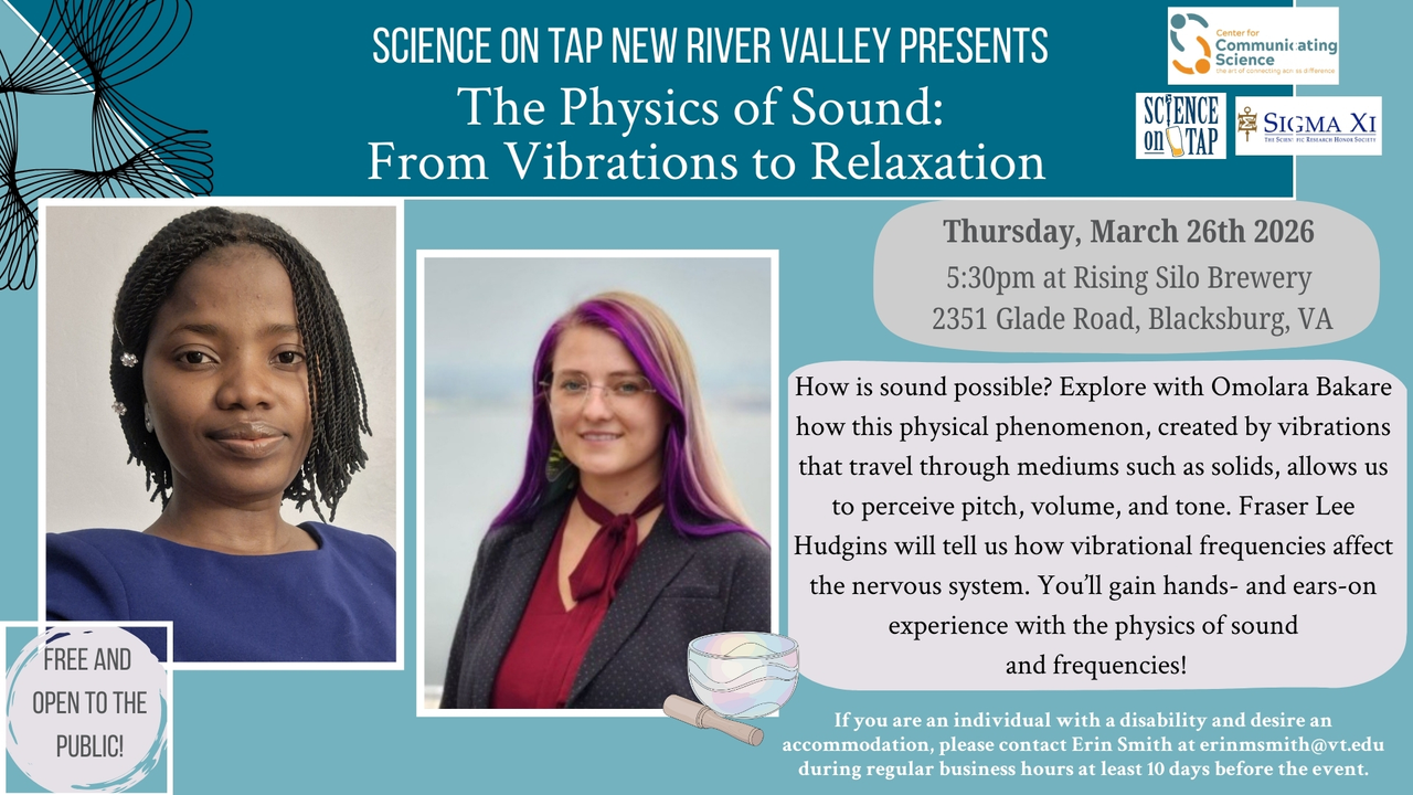 Science on Tap New River Valley presents the March program "The Physics of Sound: From Vibrations to Relaxation" on Thursday, March 26, 2026 at Rising Silo Farm Brewery.