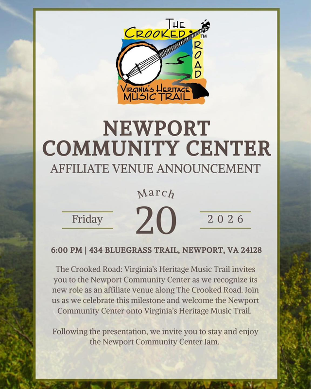 The Crooked Road: Virginia’s Heritage Music Trail invites you to the Newport Community Center as we recognize its new role as an affiliate venue along The Crooked Road. Join us as we celebrate this milestone and welcome the Newport Community Center onto Virginia’s Heritage Music Trail.