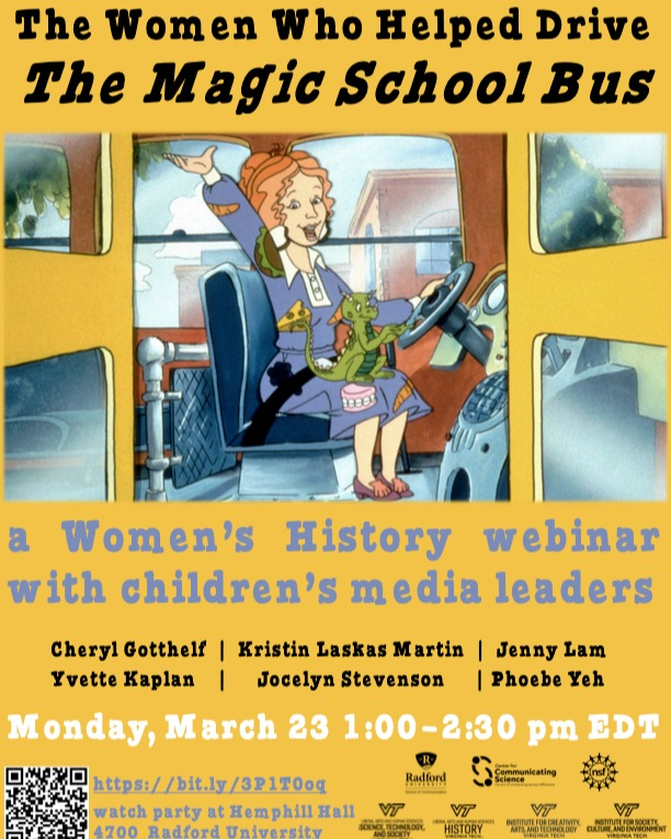 Departments at Radford University and Virginia Tech presents the Virtual Panel titled "The Women Who Helped Drive The Magic School Bus" on Monday, March 23, 2026 offered online on Zoom as well as a in-person Watch Party at Hemphill Hall 4700 on the campus of Radford University.
