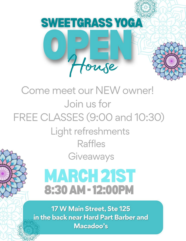 Sweetgrass Yoga presents an Open House on Saturday, March 21, 2026.