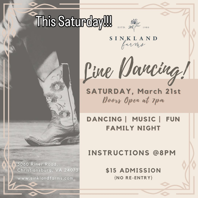 Sinkland Farms presents Family Night Line Dancing for all ages on Saturday, March 21, 2026.