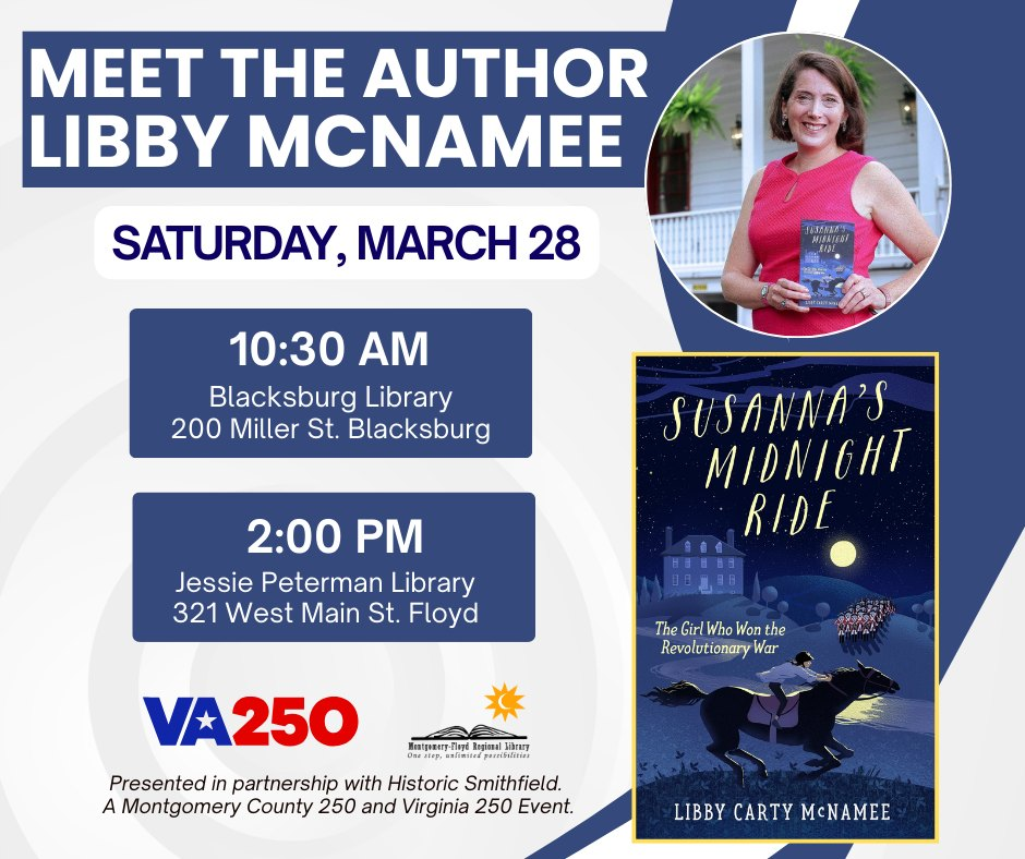 The Blacksburg Library presents Meet the Author Libby McNamee on Saturday, March 28, 2026.