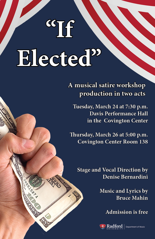 The Radford University College of Visual & Performing Arts presents the presents Music Satirical Workshop titled "If Elected" on Tuesday, March 24, 2026 at 7:30 PM inside Performance Hall located within the Covington Center and on Thursday, March 26, 2026 at 5:00 PM inside the Covington Center Room 138 on the campus of Radford University.