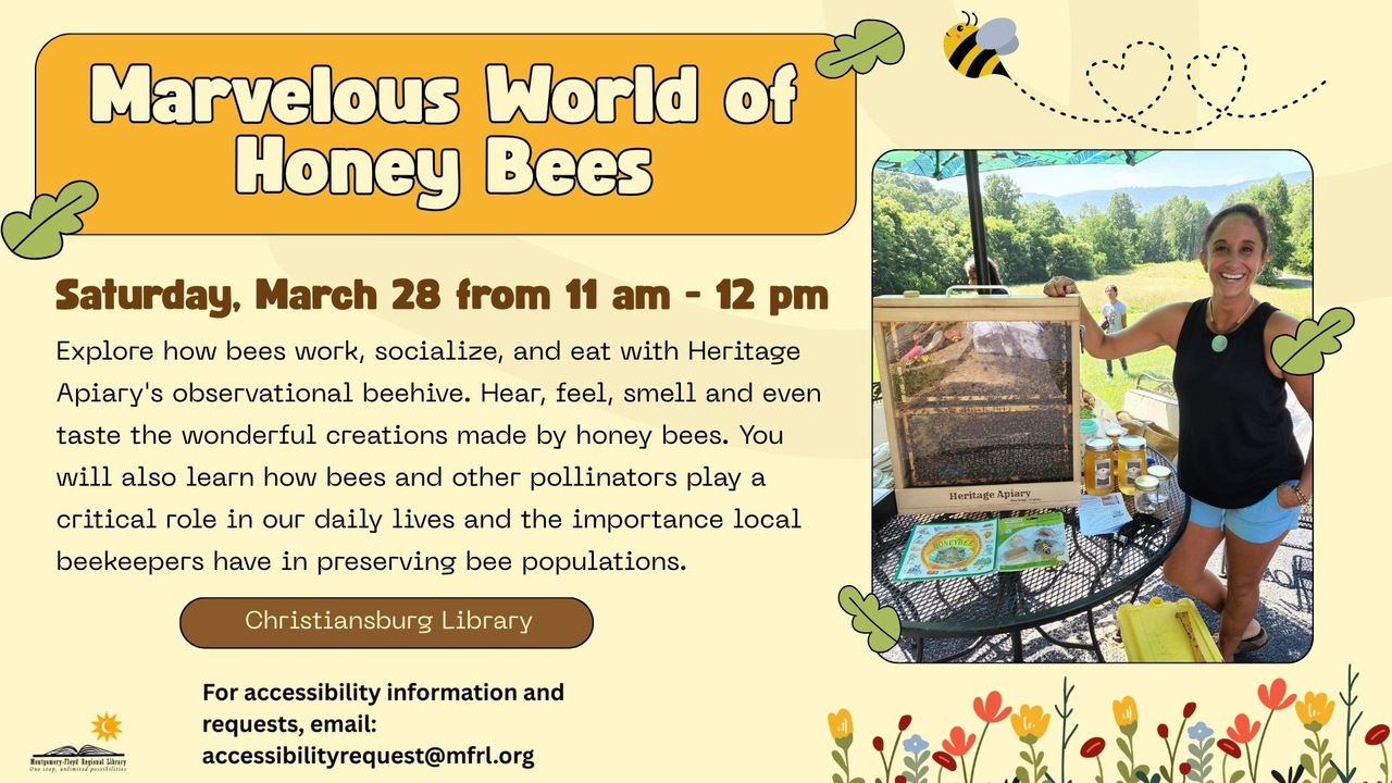 The Christiansburg Library presents the program "Marvelous World of Honey Bees" on Saturday, March 28, 2026.