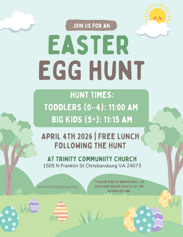 Trinity Community Church presents their Annual Easter Egg Hunt with Free Lunch on Saturday, April 4, 2026.
