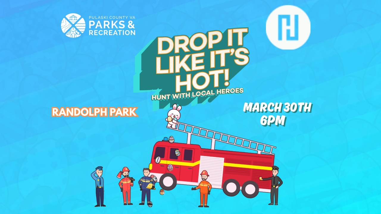 The Pulaski County Parks & Rec and New Hope Church NRV presents the 2nd Annual "Drop It Like It's Hot!" Easter Egg Hunt featuring local heroes on Monday, March 30, 2026 at Randolph Park in Dublin, VA.