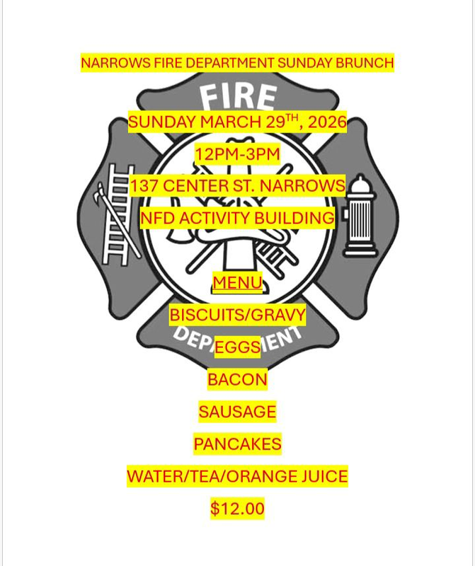 The Narrows Fire Department presents their Sunday Brunch on Sunday, March 29, 2026 inside the Activity Building.