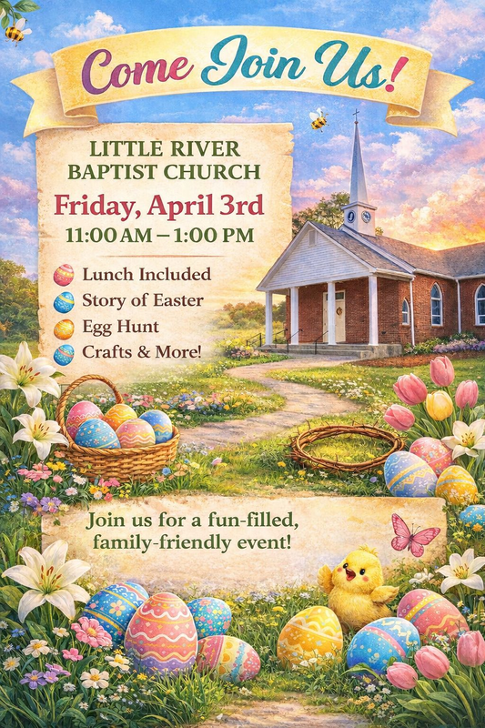 Little River Baptist Church presents their 2026 Easter Egg Hunt & Lunch on Friday, April 3, 2026.