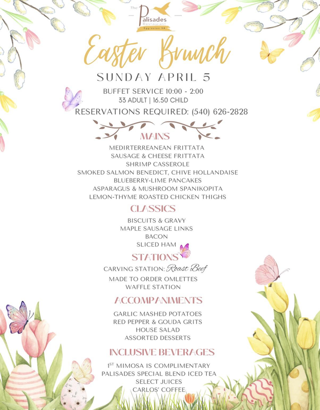 Lock in those plans now and join us for Easter Brunch at The Palisades Restaurant. From smoked salmon benedict to blueberry-lime pancakes and a roast beef carving station… it’s going to be a beautiful spread. Seating begins at 10:00 AM and the final seating will be at 2:00 PM.