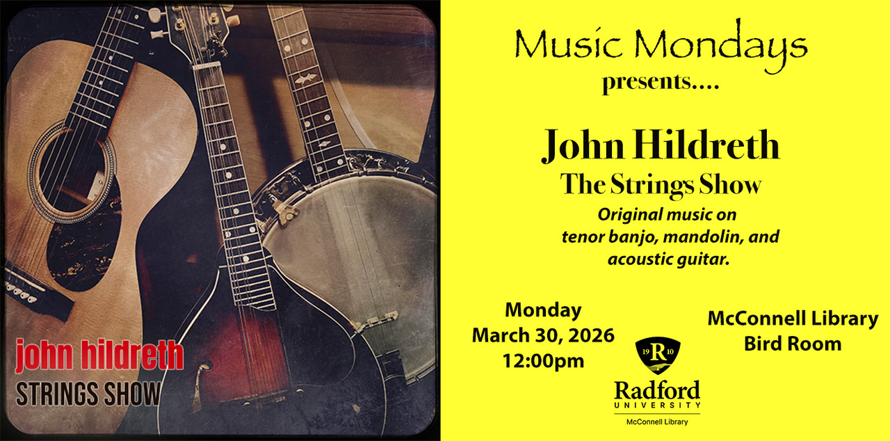The McConnell Library, on the campus of Radford University, and Radford University Archives and Special Collections continues their Spring Semester Music Mondays series with John Hildreth performing "The Strings Show" in concert on Monday, March 23, 2026 inside the Bird Room.