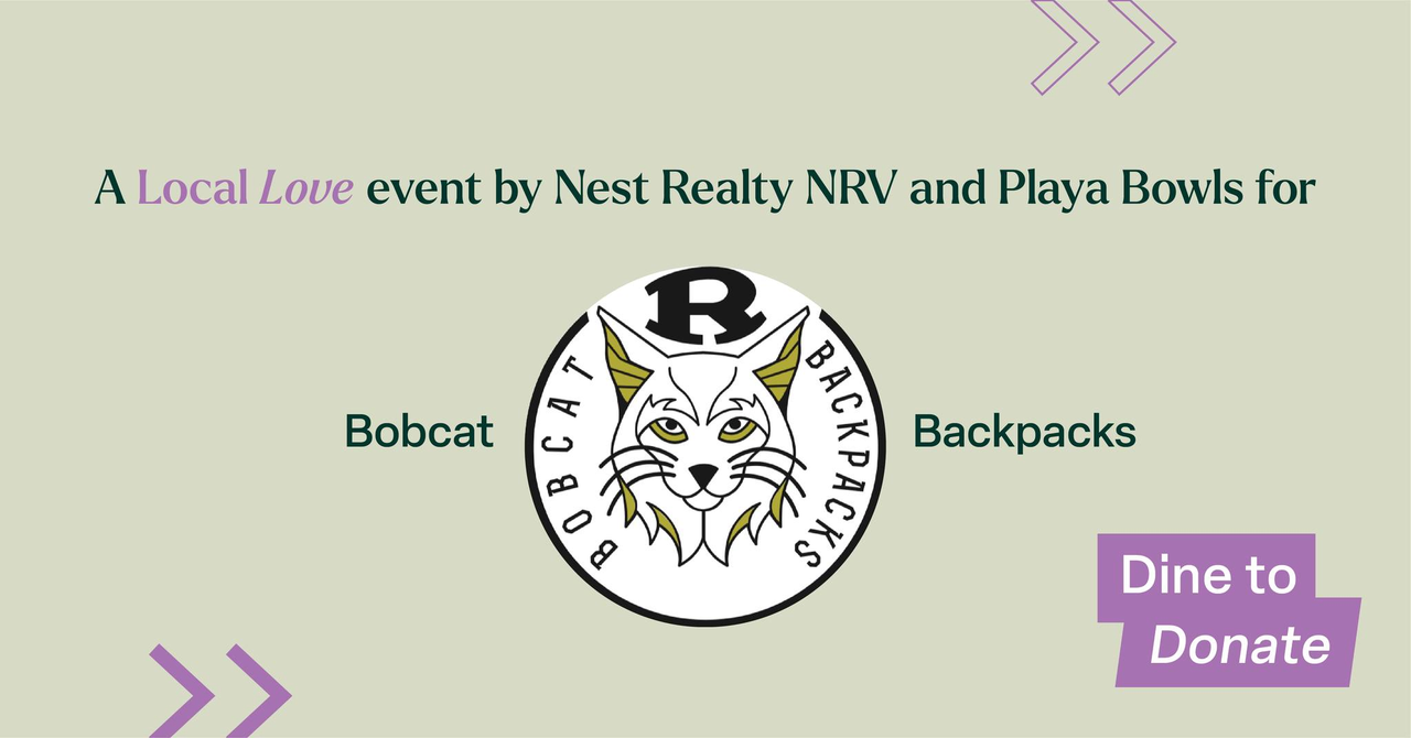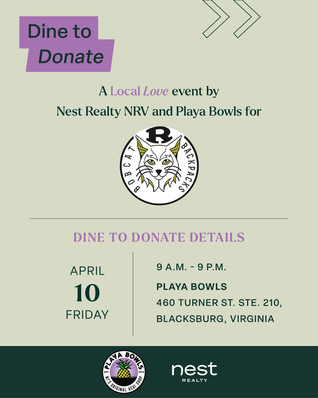 To kick off spring, Nest Realty NRV has partnered with Playa Bowls in Blacksburg, VA to host a Dine to Donate event, with proceeds going to Bobcat Backpacks, an organization that provides weekly meals to students in Radford City schools.