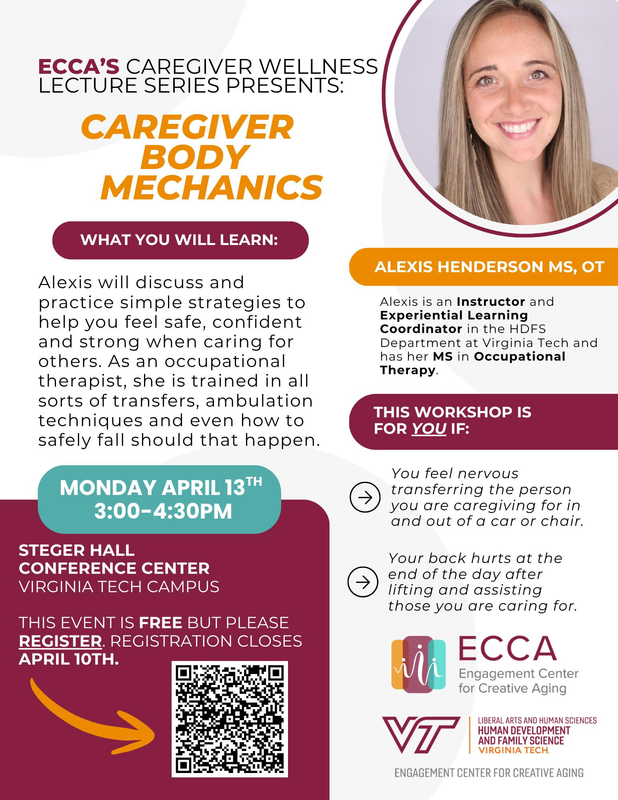 The Engagement Center for Creative Aging at Virginia Tech presents a Caregiver Body Mechanics Lecture on Monday, April 13, 2026 inside the Steger Hall Conference Center on the campus of Virginia Tech.