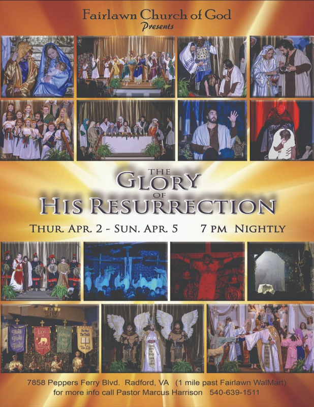 The Fairlawn Church of God presents their Annual Easter Passion Play titled "The Glory of His Resurrection" with four performances starting on Thursday, April 2, 2026 through Sunday, April 5, 2026 at 7:00 PM each night.