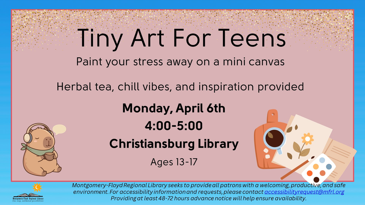 The Christiansburg Library presents the program Tiny Art For Teens on Monday, April 6, 2026.