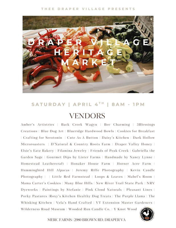 Located in the heart of Draper, VA, the Draper Village Heritage Market is a vibrant gathering place that celebrates our community’s rich heritage, craftsmanship, and agricultural roots. Experience the best of local arts, crafts, and food while enjoying workshops, hands-on demonstrations, and interactive exhibits that honor traditions and promote sustainable living. Join us to grow roots, get grounded, and embrace the spirit of community and culture that defines Draper Village. The Heritage Market will be held on the first Saturday of the month from April through December.
