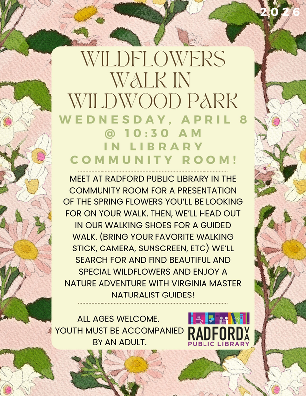 The Radford Public Library presents a Wildflowers Walk in Wildwood Park on Wednesday, April 8, 2026 meeting at the library.