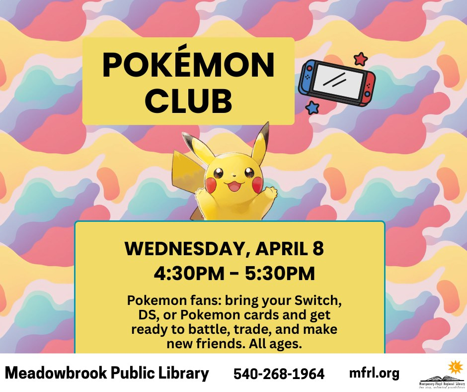 The Meadowbrook Public Library presents the April Pokemon Club on Wednesday, April 8, 2026.