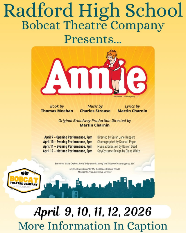 The Bobcat Theatre Company presents the play "Annie" with four performances starting on Thursday, April 9, 2026 through Sunday, April 12, 2026 at Radford High School.