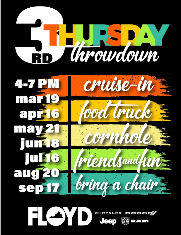 Floyd Chrysler Dodge Jeep Ram presents their April Third Thursday Throwdown on Thursday, April 16, 2026.