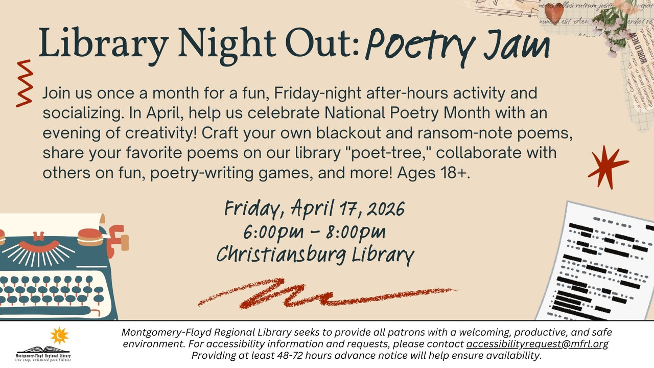 The Christiansburg Library presents Library Night Out: Poetry Jam on Friday, April 17, 2026.