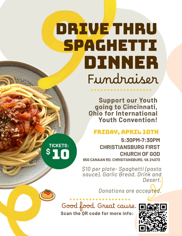 The First Church of God Christiansburg presents a Drive Thru Spaghetti Dinner on Friday, April 10, 2026.