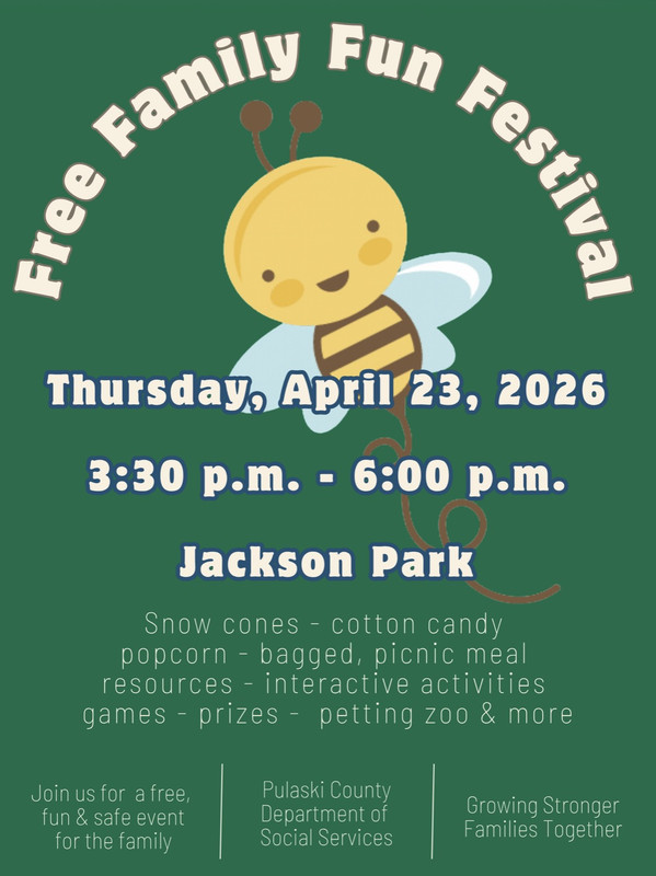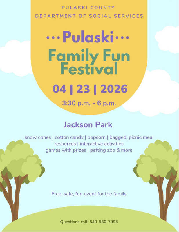 The Pulaski County Department of Social Services and NRV Cares presents the 4th Annual Free Family Fun Festival on Thursday, April 23, 2026 at Jackson Park in Pulaski, VA.