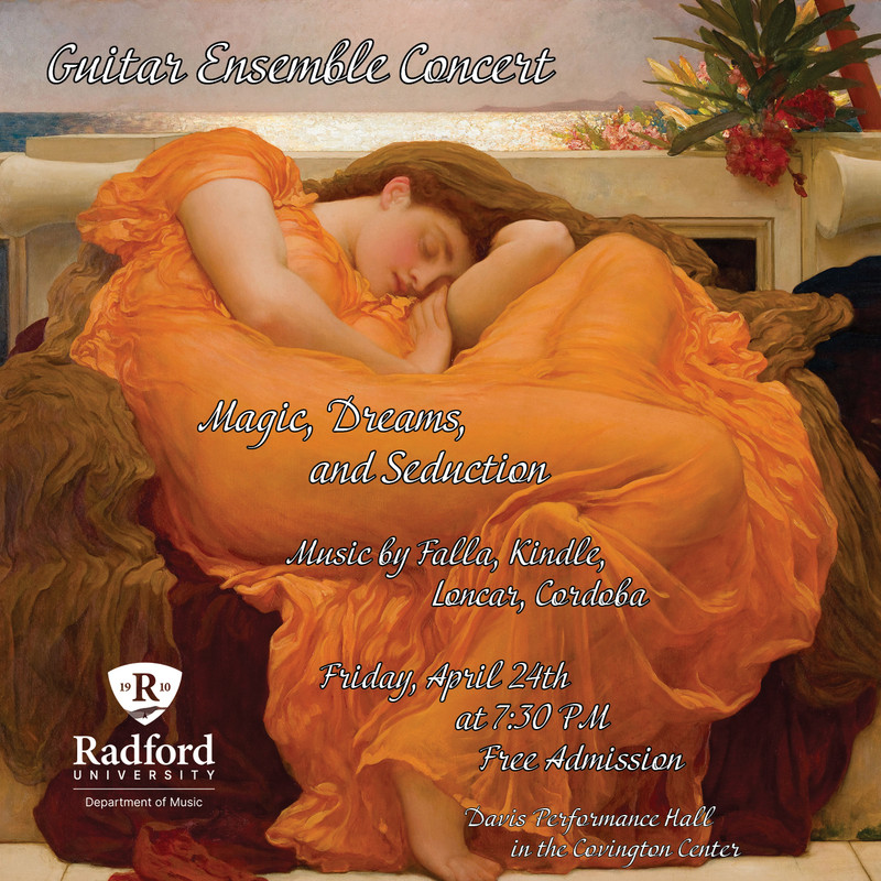 The Radford University College of Visual & Performing Arts presents the Radford University Guitar Ensemble Spring Concert titled "Magic, Dreams, and Seduction" on Friday, April 24, 2026 inside Performance Hall located within the Covington Center on the campus of Radford University.