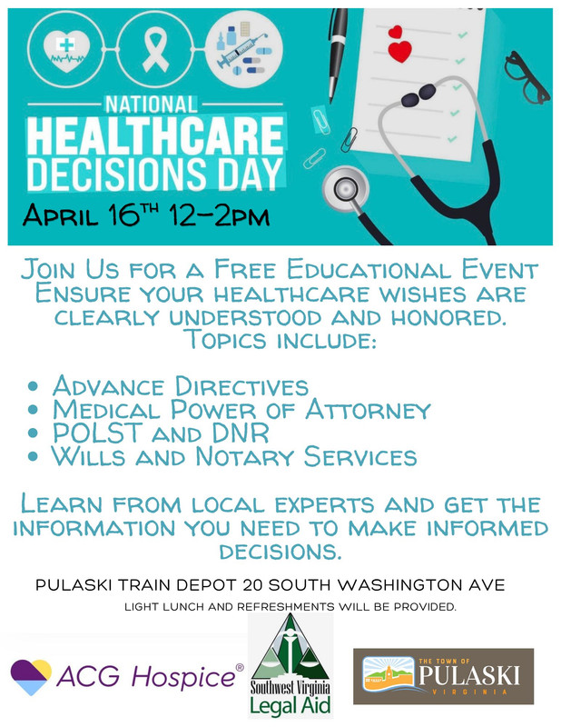 The Town of Pulaski, ACG Hospice and Southwest Virginia Legal Aid presents a National Healthcare Decisions Day program on Thursday, April 16, 2026 at the Pulaski Train Station.