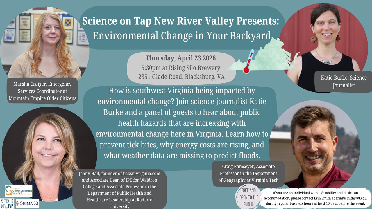 Science on Tap New River Valley presents the April program titled "Environmental Changes in Your Backyard" on Thursday, April 23, 2026 at the Rising Silo Farm Brewery.