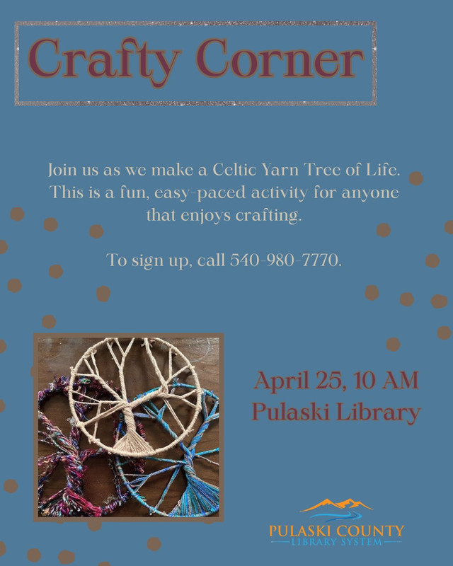 The Pulaski County Library continues their Crafty Corner series with "Celtic Yarn Tree of Life" on Saturday, April 25, 2026.